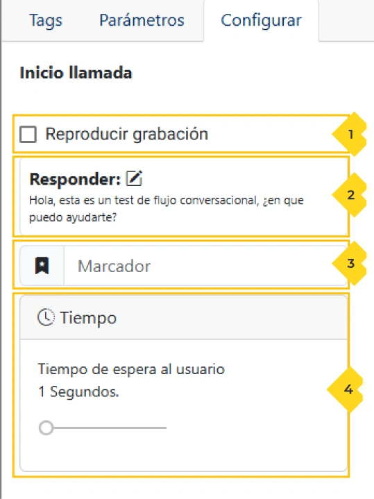 - Responder: Si deseas que tu saludo inicial sea más personalizado, aquí podrás ingresar el mensaje inicial que la asistente virtual pronunciará cuando el usuario atienda la llamada. Además, puedes añadir variables para hacer el saludo aún más personal, como mencionar su nombre.